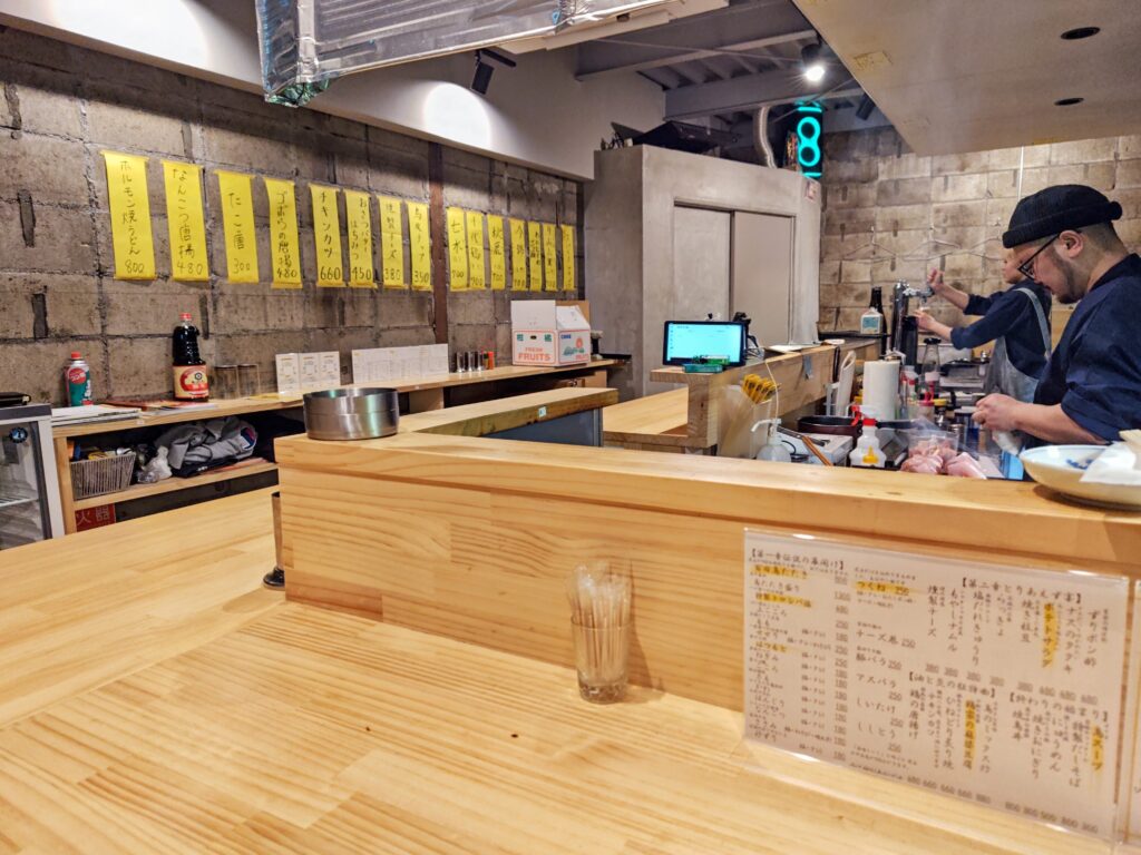 全席禁煙、全カウンター15席のコンクリートブロック積を多用した個性的な店内です。