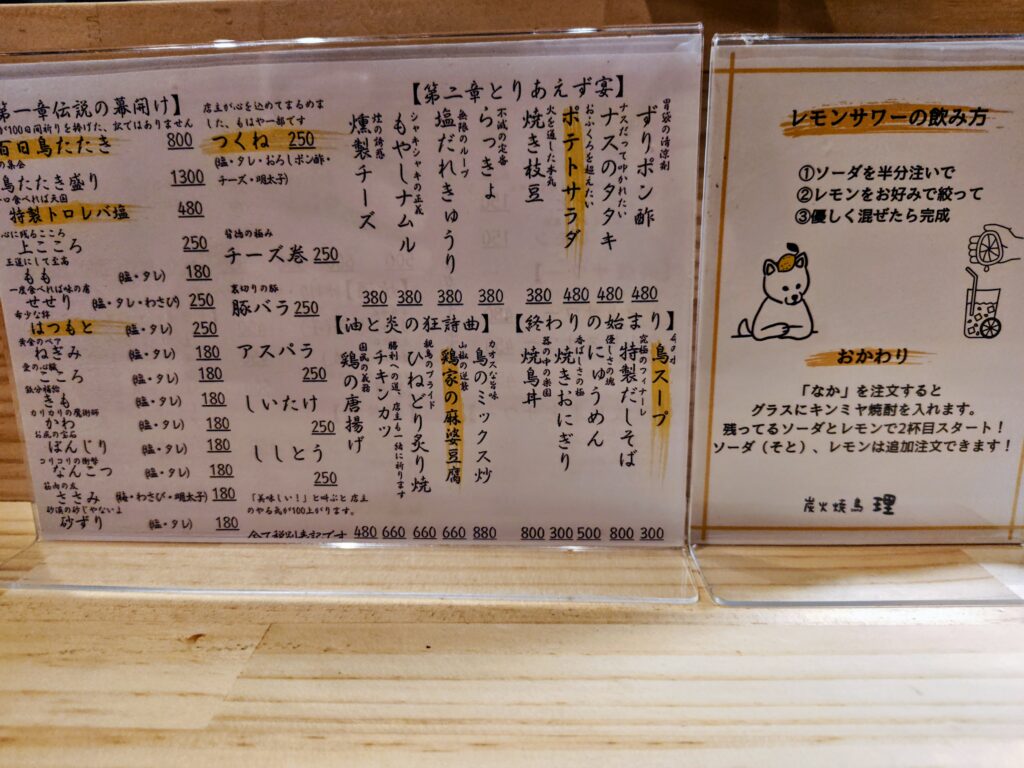 フードメニューは第一章伝説の幕開け(焼鳥各種)、第二章とりあえず宴(一品)、油と炎の狂詩曲(焼き・揚げ)、終わりの始まり(スープ、麺類、ご飯類)のラインナップです。