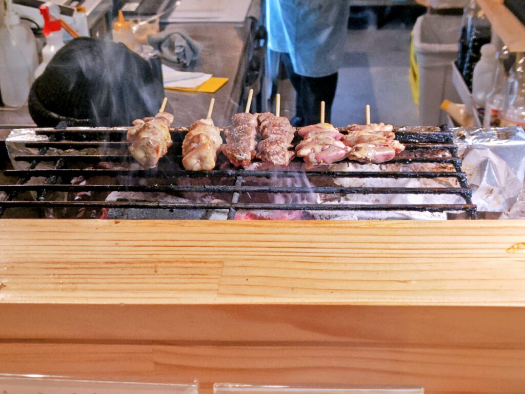 店主さんとスタッフさんの2オペで、店主さんが炭火で焼鳥を焼かれています。