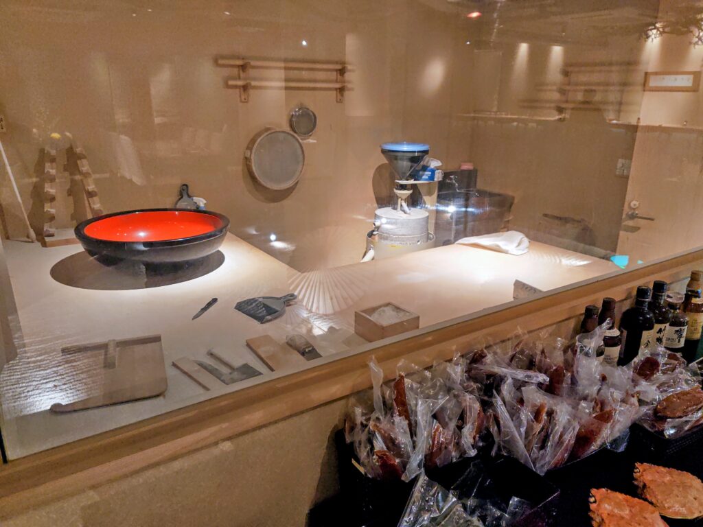 入口側の蕎麦打ち部屋があり、蕎麦用の石臼が回っています。
