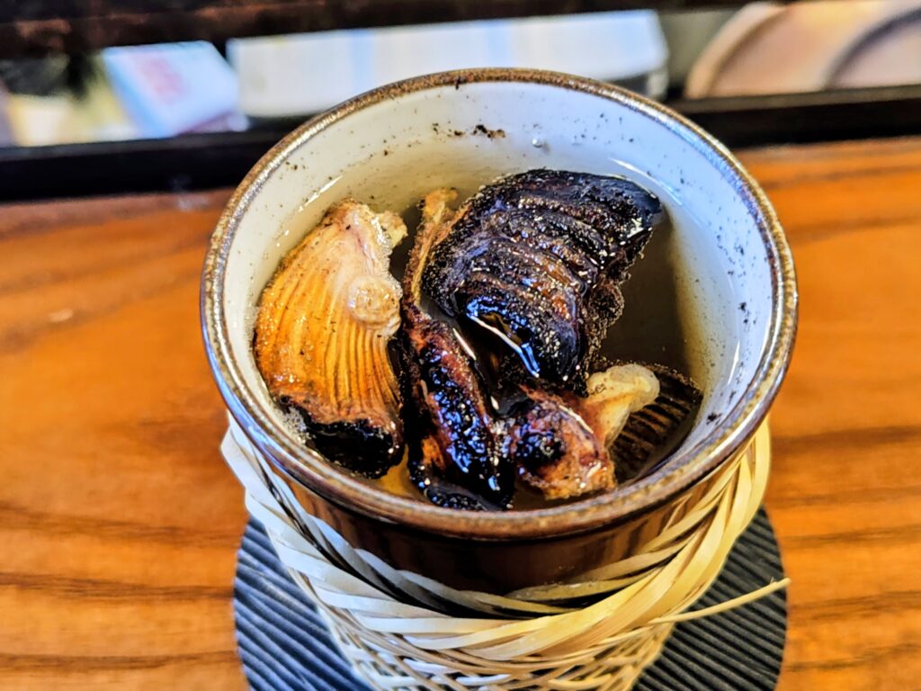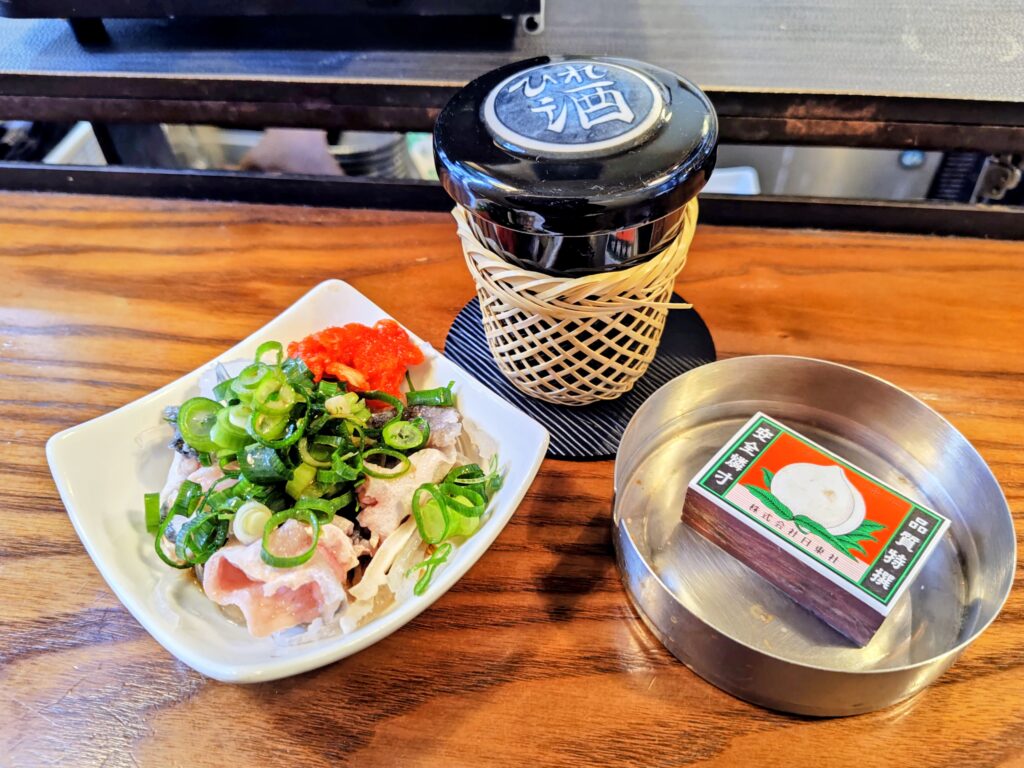 ヒレ酒は蓋あり湯呑に。アルコールを飛ばすマッチと提供されます(説明等なし、カウンター上部に置かれるのみ)