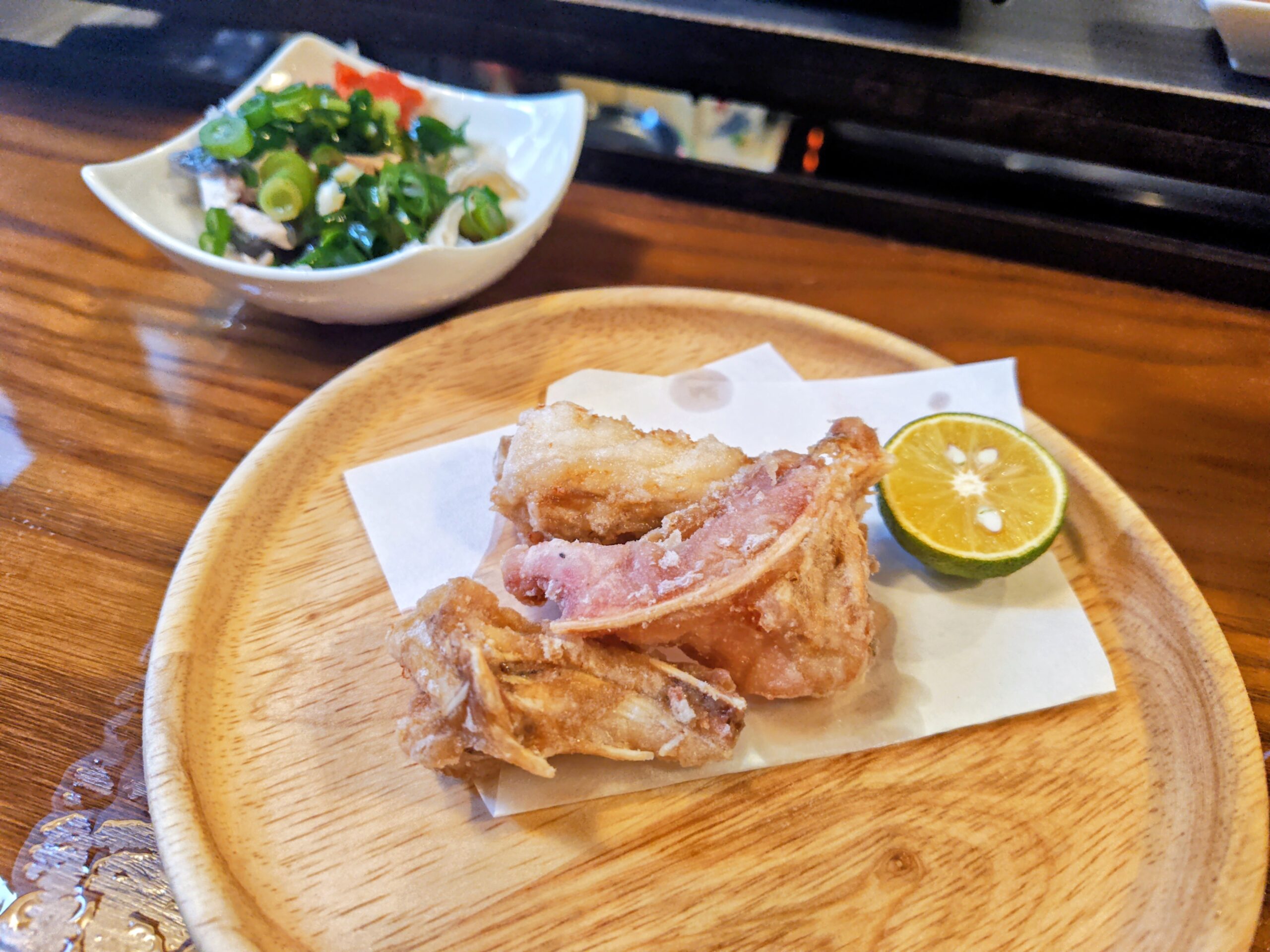 揚げたてのサクッと衣に骨付とらふぐ!下味は薄めで骨周りの身を齧る幸せです。
