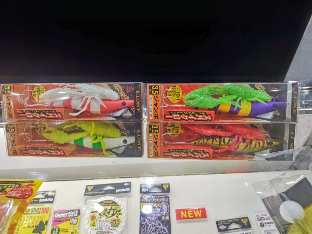 アイの位置を2箇所あったり、カンナ部にタコ墨族と違いブレードを付けない代わりにタコベイトを装着するモデルがあったりと工夫されています。左側1番下だけ4寸サイズです。サイズバリエーションは3、3.5、4寸、カラーは白、黄、緑、赤、ピンク、緑、青と単色系は全て網羅しています。