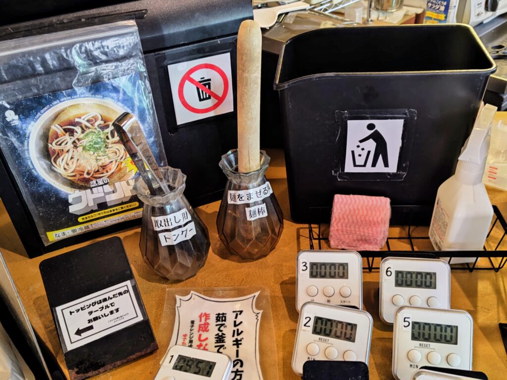 反時計回りにキッチンタイマー・麺棒・トング⇒うどん・出汁等を湯掻き場、お皿・味変薬味テーブル。
