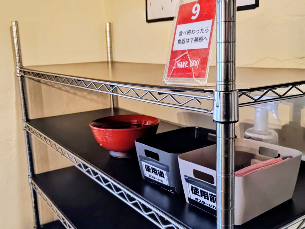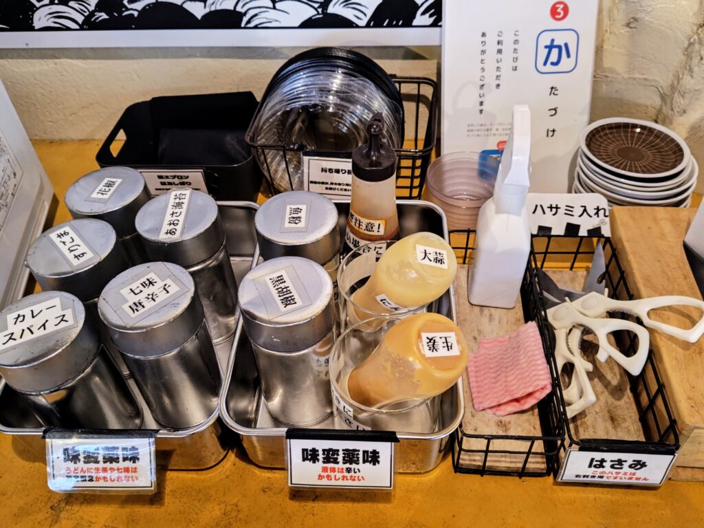 うどん・出汁を回収しお皿・味変薬味テーブルに。