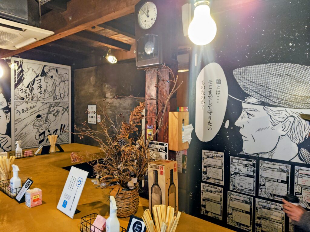 古民家リノベのHP記載の漫画が貼られ個性的な店内です。