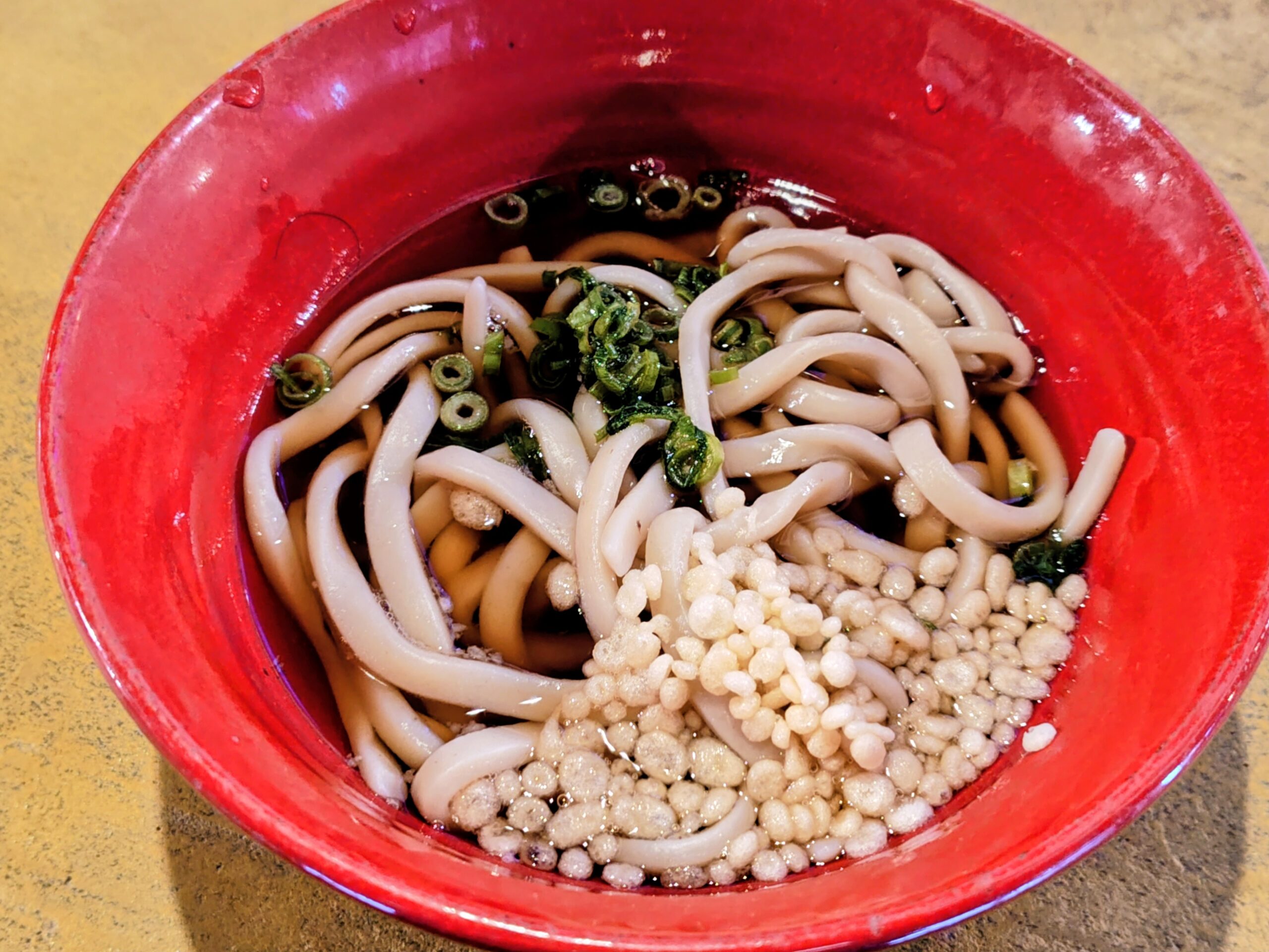 うどん出汁のナイロンを切るキッチンハサミあり、薬味等はご自由に。