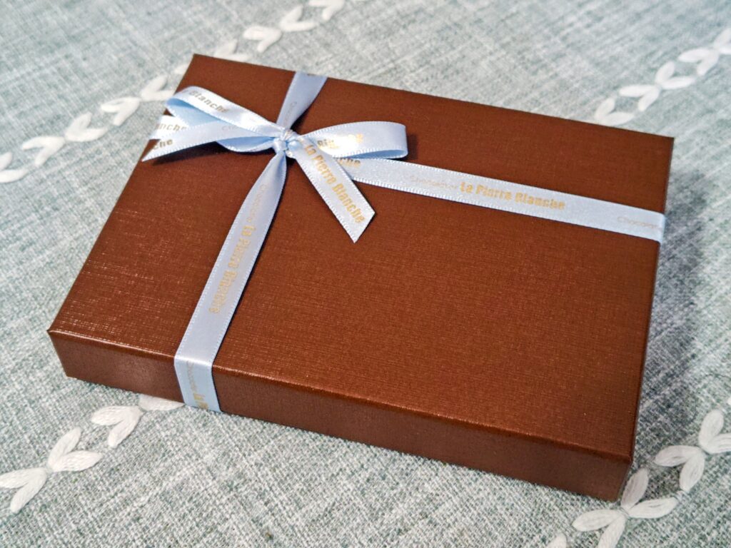 シンプルにブラウンBOXに店名の入ったリボン掛け。