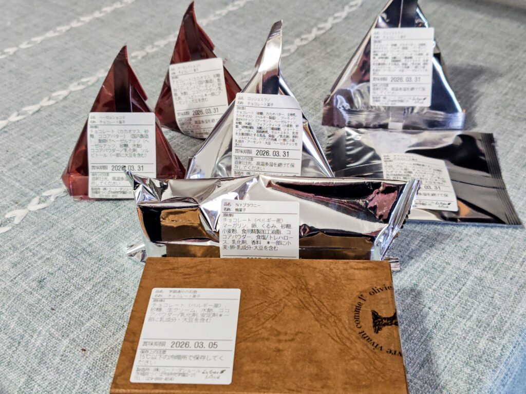 BOXから取り出すと、学園通りの石畳、アーモンドショコラ、ヘーゼルショコラ、・NYブラウニー、ロッシェミラノ×2、オランジェットの詰合せ!