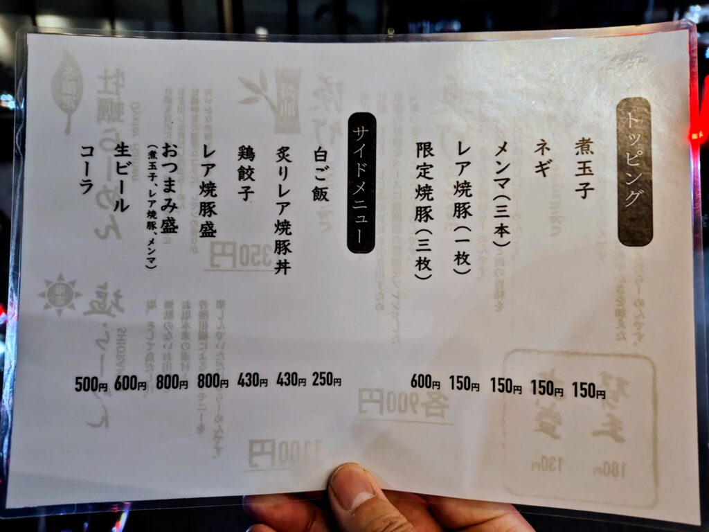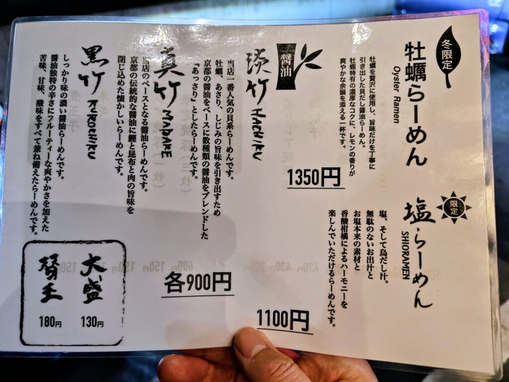 限定は塩らーめん、冬のみの牡蠣らーめん、トッピング、サイドメニューは充実しています。