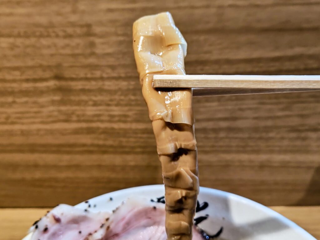 大ぶりなチャーシューは赤身と脂身のバランスよく、しっとり肉の旨味を感じることができ、脂がスープに溶け出し相乗効果です。