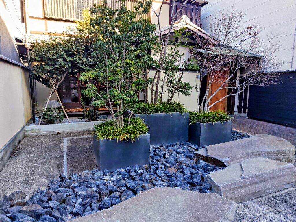 明治時代築の町屋をリノベーションした建物に植栽と石と全体のバランスが絶妙な外観に仕上がっています。