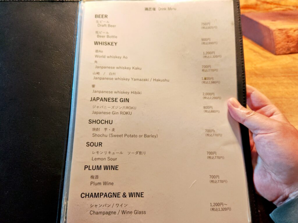 ドリンクメニューはビール、ノンアルコール、日本酒、シャンパーニュ、白ワイン、赤ワインのグラスにボトル。