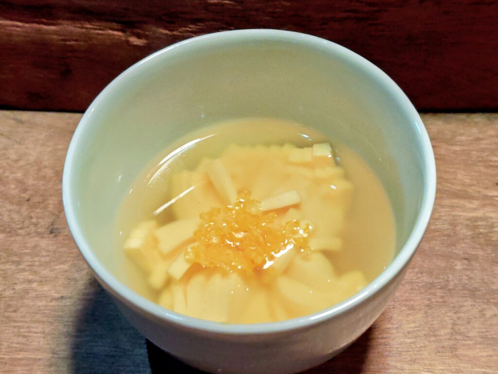 鶏の旨味がしっかりと出汁感よく胃を温めて、コースを期待させる一品です。