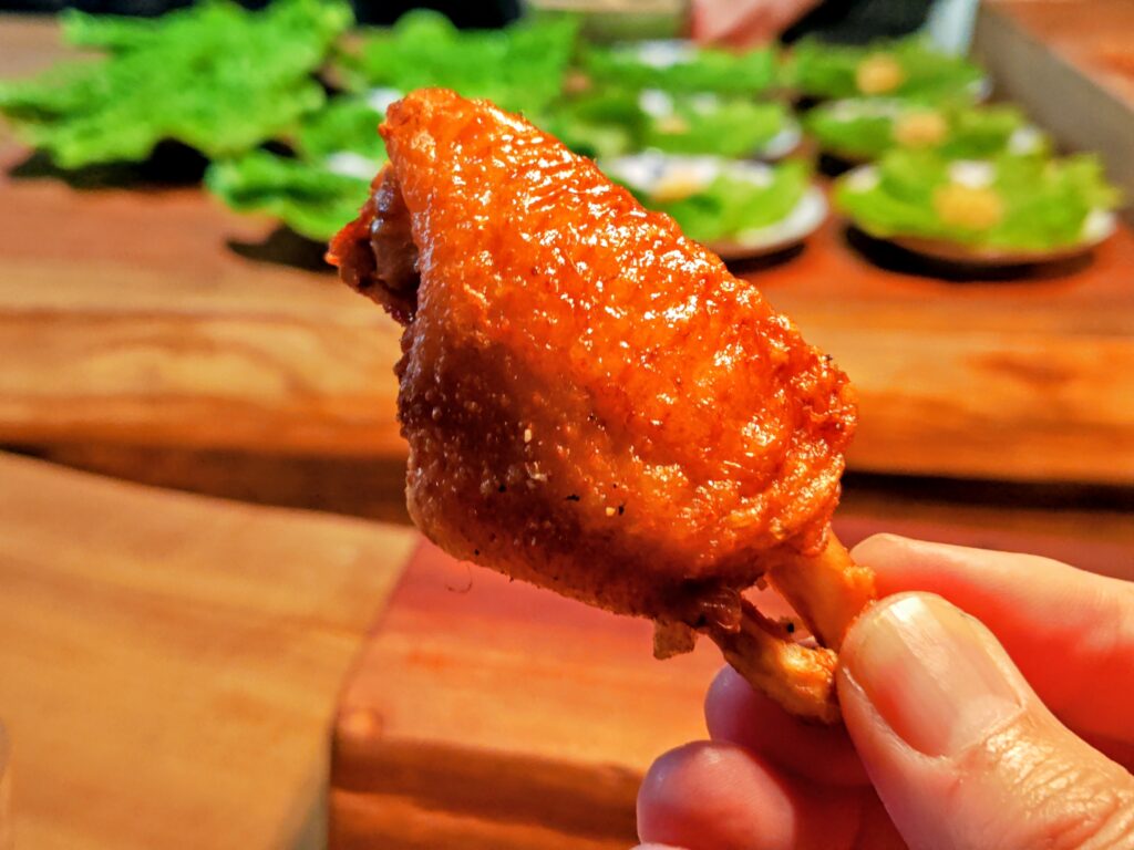 5分ほど皮側をスモークされて香りよく骨際をしゃぶりついて綺麗に頂きます。
