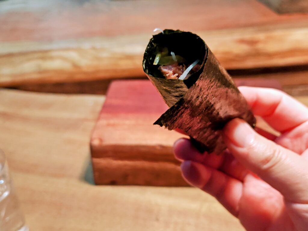 軽く焼かれた海苔にたっぷりタレの河内鴨に沢庵、タレがこぼれないよう下側まで海苔を巻いて蓋をされています。