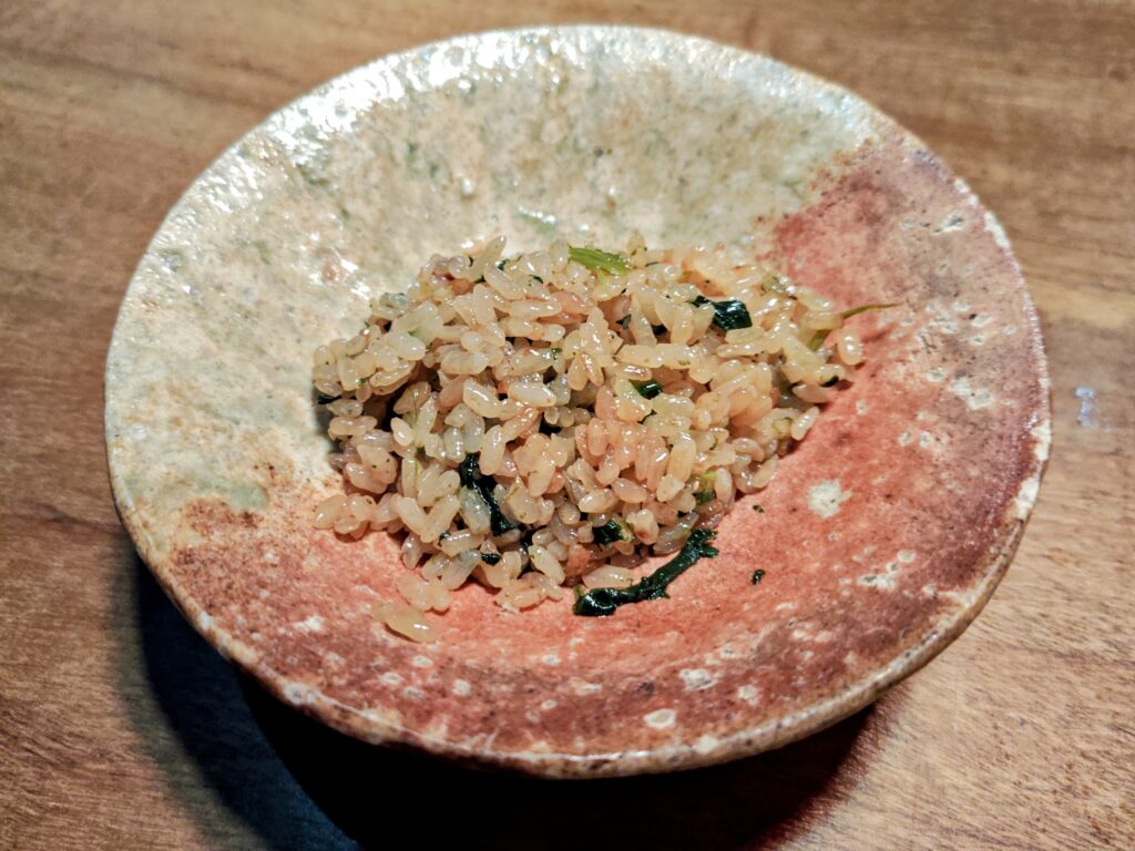 ご飯の粒が立ち、ちぢみほうれん草の彩りと生姜のアクセントの炊き込みご飯です。
