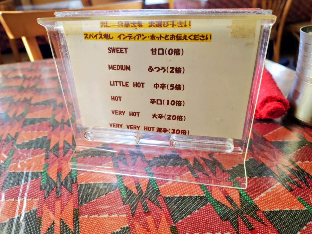 カレーの辛さは甘口(0倍)、ふつう(2倍)、中辛(5倍)、辛口(10倍)、大辛(20倍)、激辛(30倍)からセレクトです。