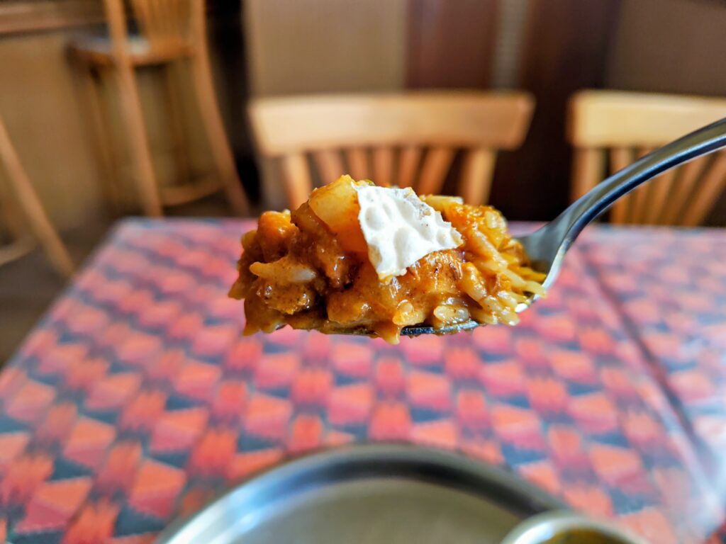 カレー、副菜、バスマティ米をざくっと混ぜ混ぜ!