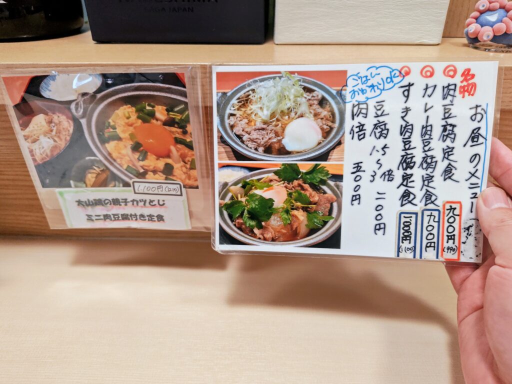 お昼のメニューは肉豆腐定食、カレー肉豆腐定食、すき肉豆腐定食、大山鶏の親子カツとじミニ肉豆腐付き定食の4種!