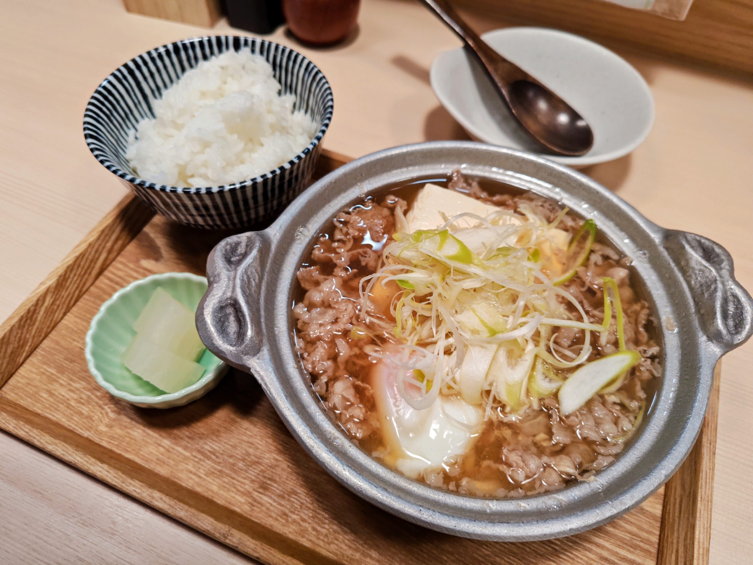 具材はシンプルに牛肉スライス、絹豆腐、温泉卵、刻み葱。