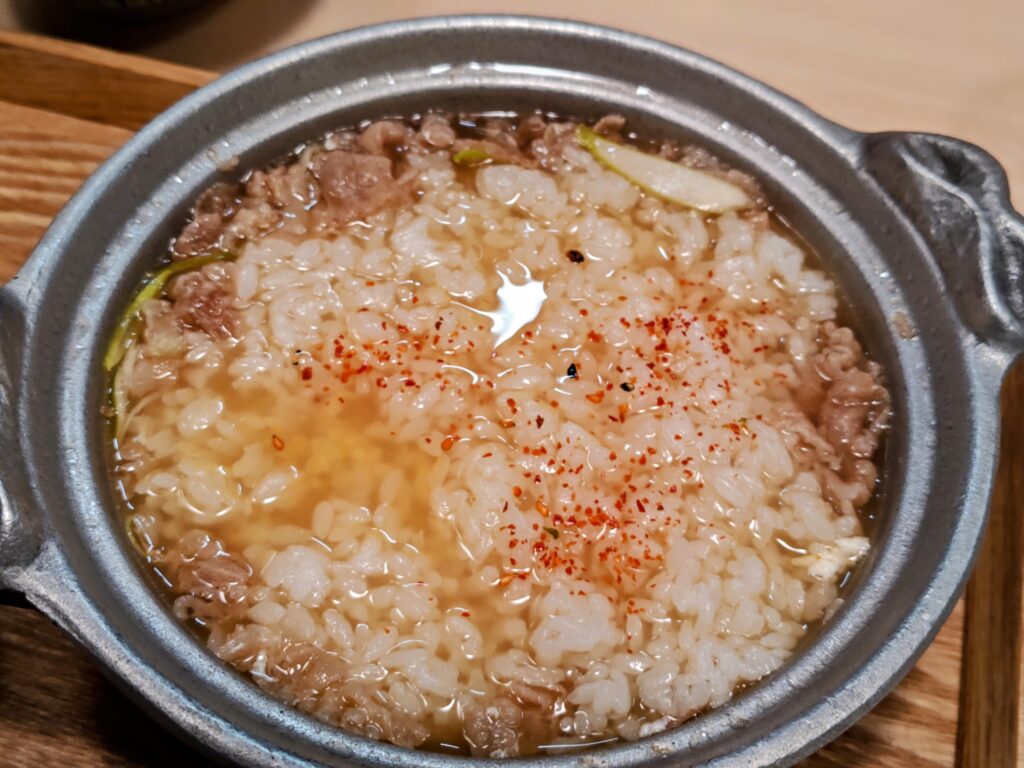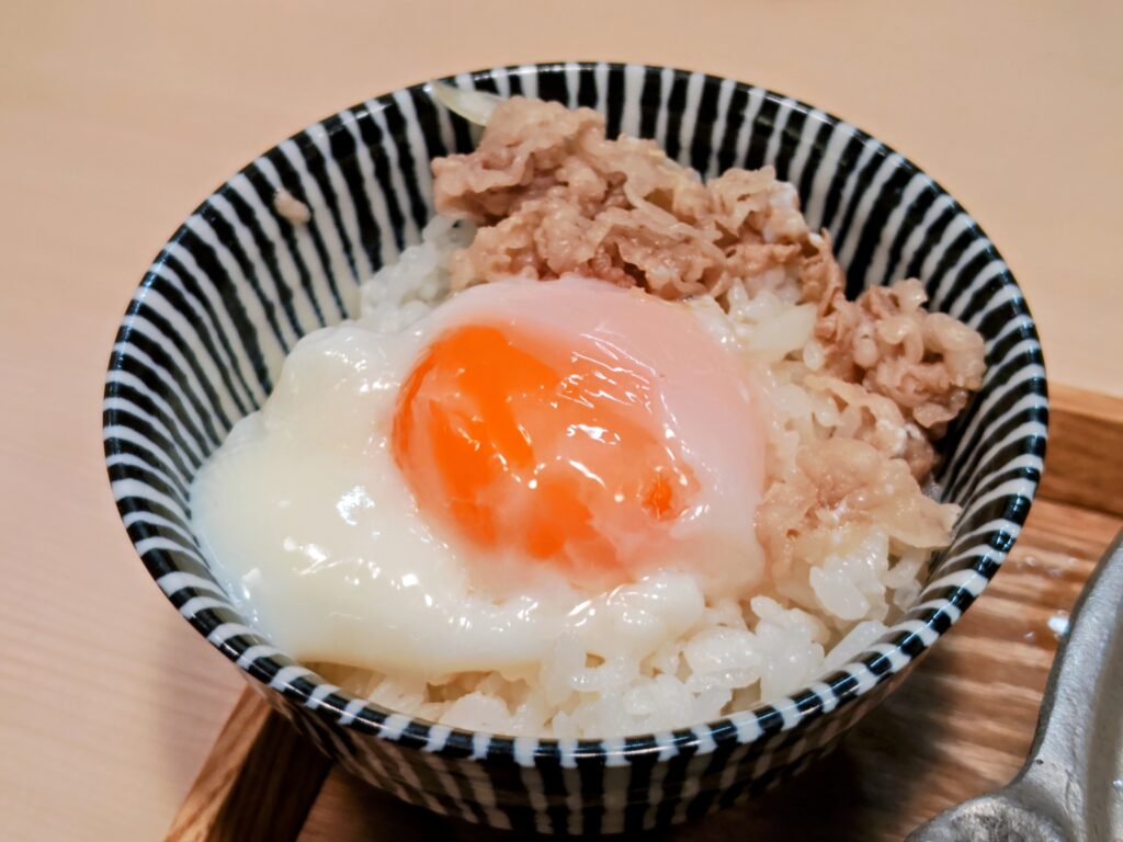 ご飯おかわり自由の1杯目は、温泉卵と牛肉オンザラスの出汁掛けで。