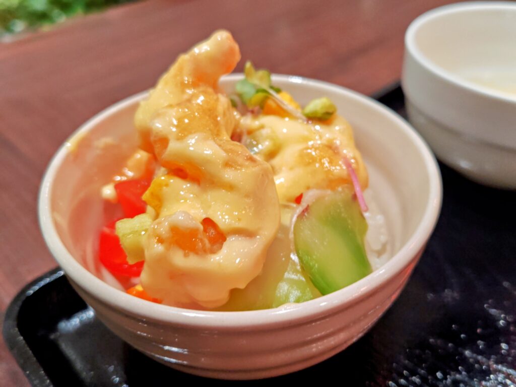 残ったご飯に大海老、ザーサイを乗せマヨネーズソースを全ぶっかけ!