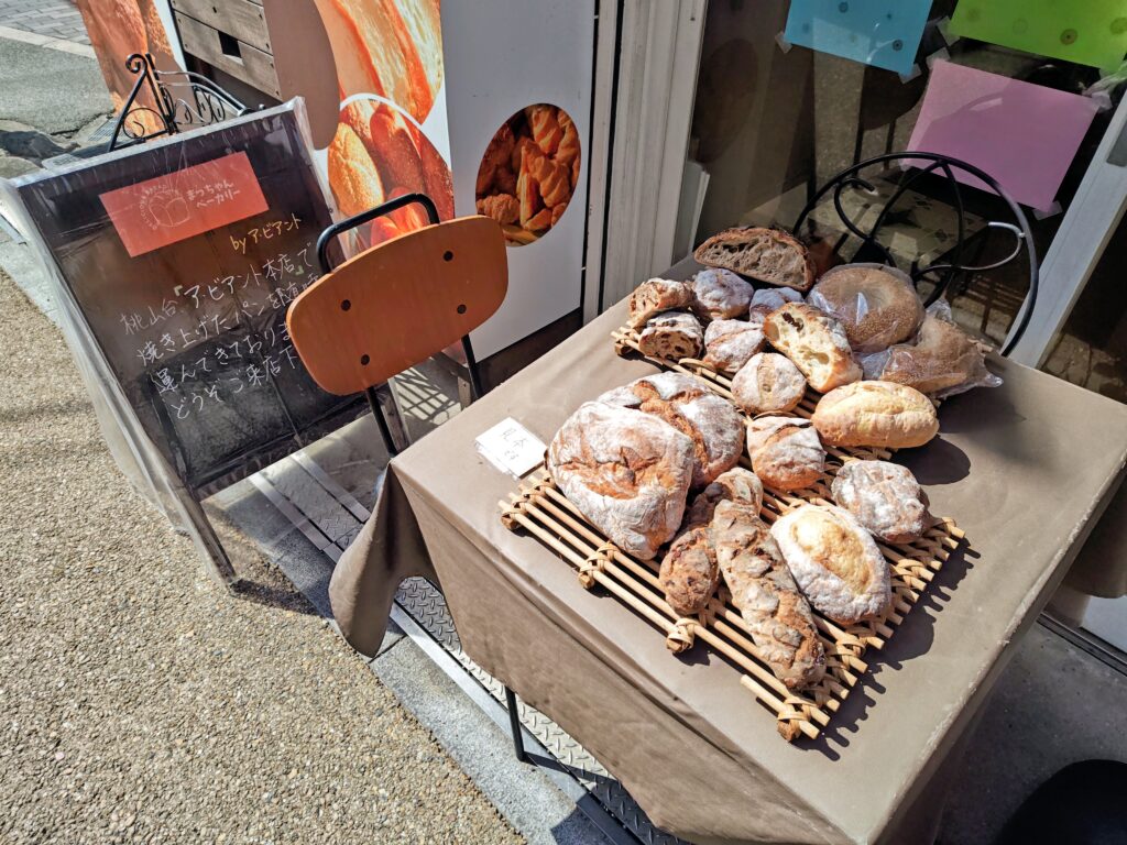 お店前にはハードパンの見本と黒板に『桃山台アビエント本店で焼き上げたパンを随時運んできております。どうぞご来店下さい』の文字が書かれています。
