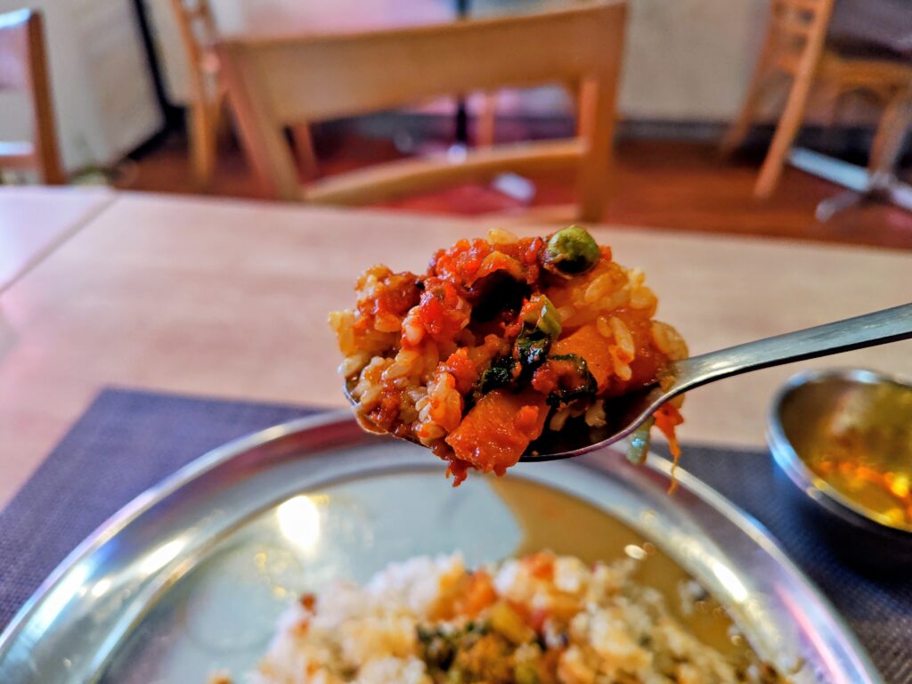 店名のヤバイスパイス屋さんから辛い系を連想しましたが、辛味はほぼ無くオイリー&スパイシーで濃厚な味付けです。