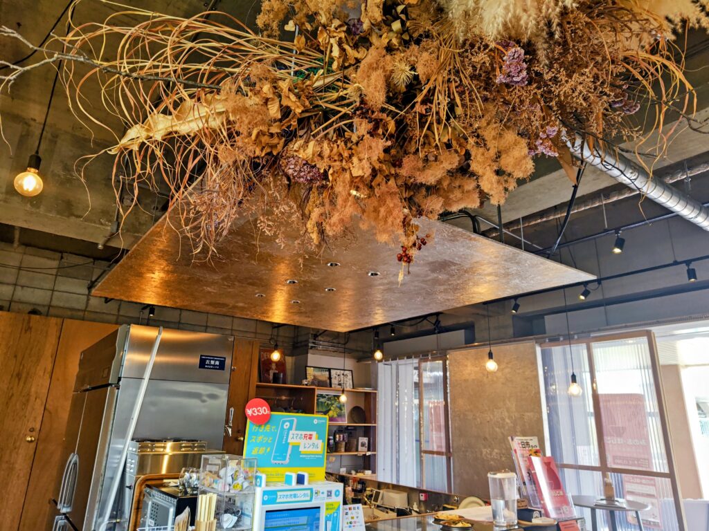 天井にドライフラワーが飾られ、スタッフさんは愛想よし!