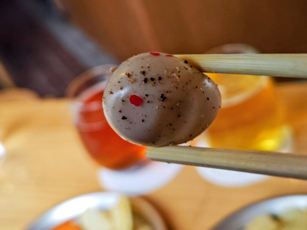 燻製醤油漬うずらは挽き立てブラックペッパーと粒のピンクペッパーが乗せられよいビールのアテに。