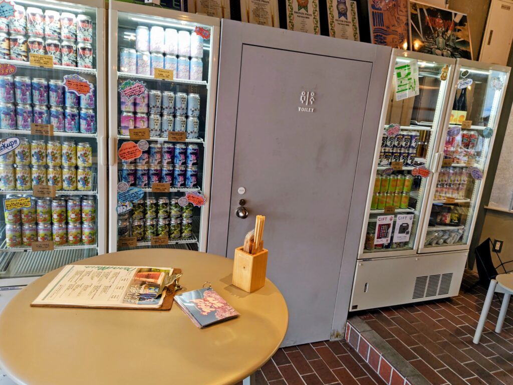 入口側にはスタンドがありクラフトビール『Derailleur Brew Works』の缶が沢山あります。