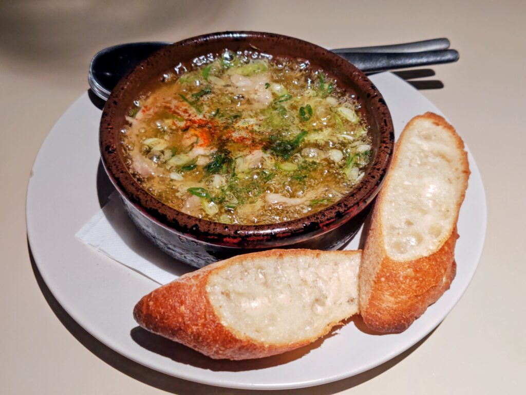 グツグツに煮立った状態で提供のアヒージョ。ニンニク香り、鶏セセリの旨味と脂がオリーブオイルにうつりカリッとしたバケットをたっぷり浸して食べるのがベターです。