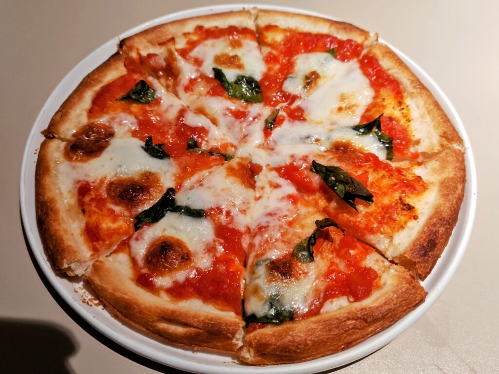 飲みなら2人でシェアするのがベターなサイズ、生地はもっちりサクッとトマトソース、チーズと食べ応えあるピッツァです。