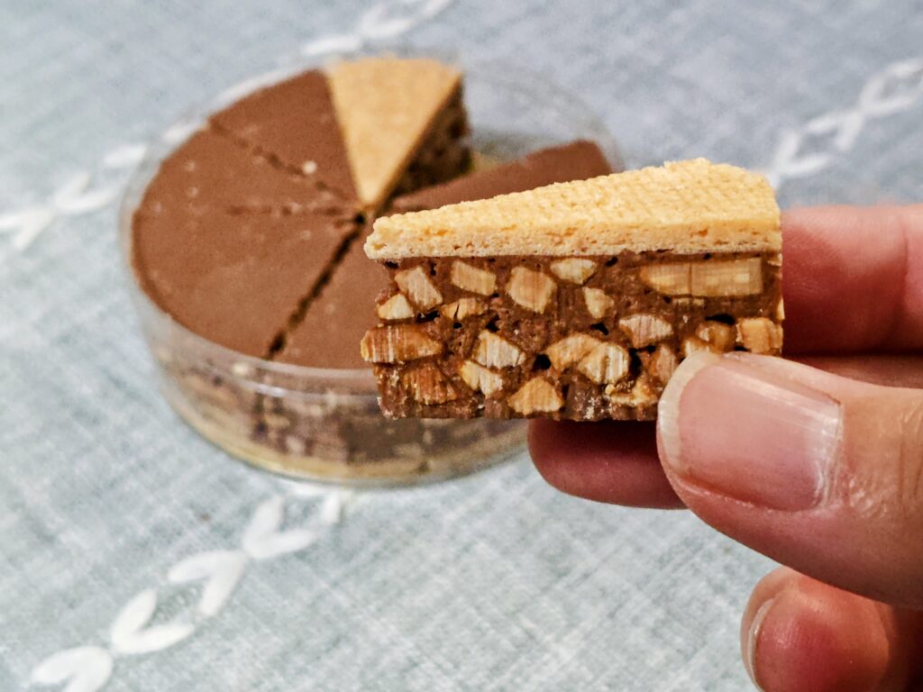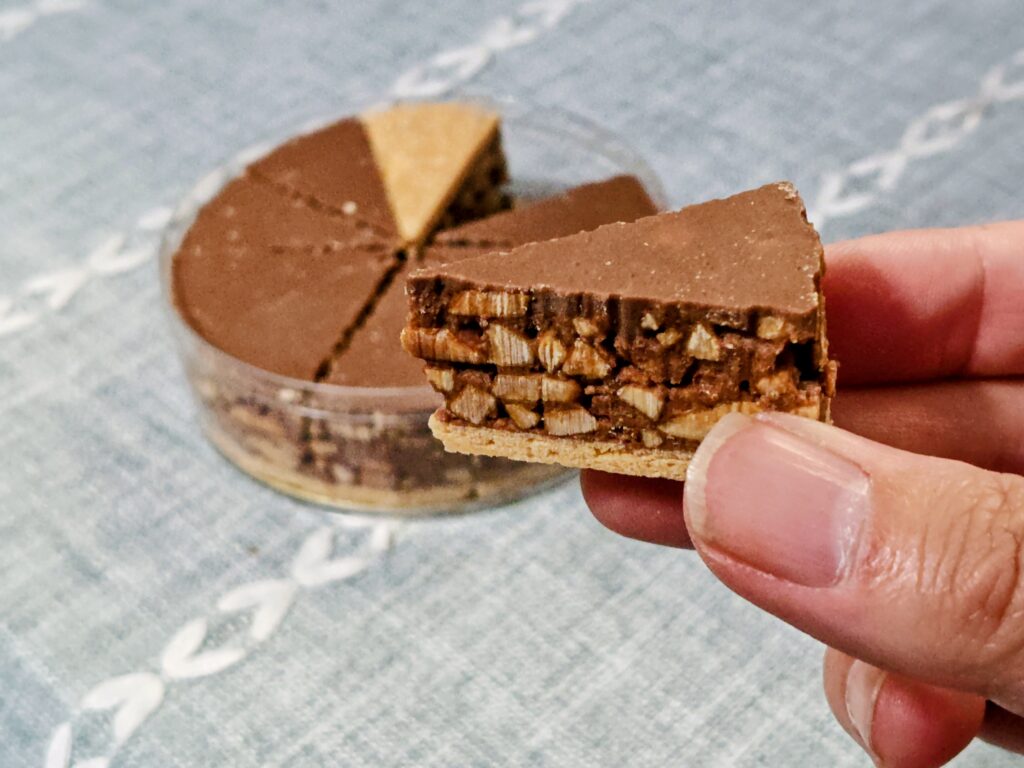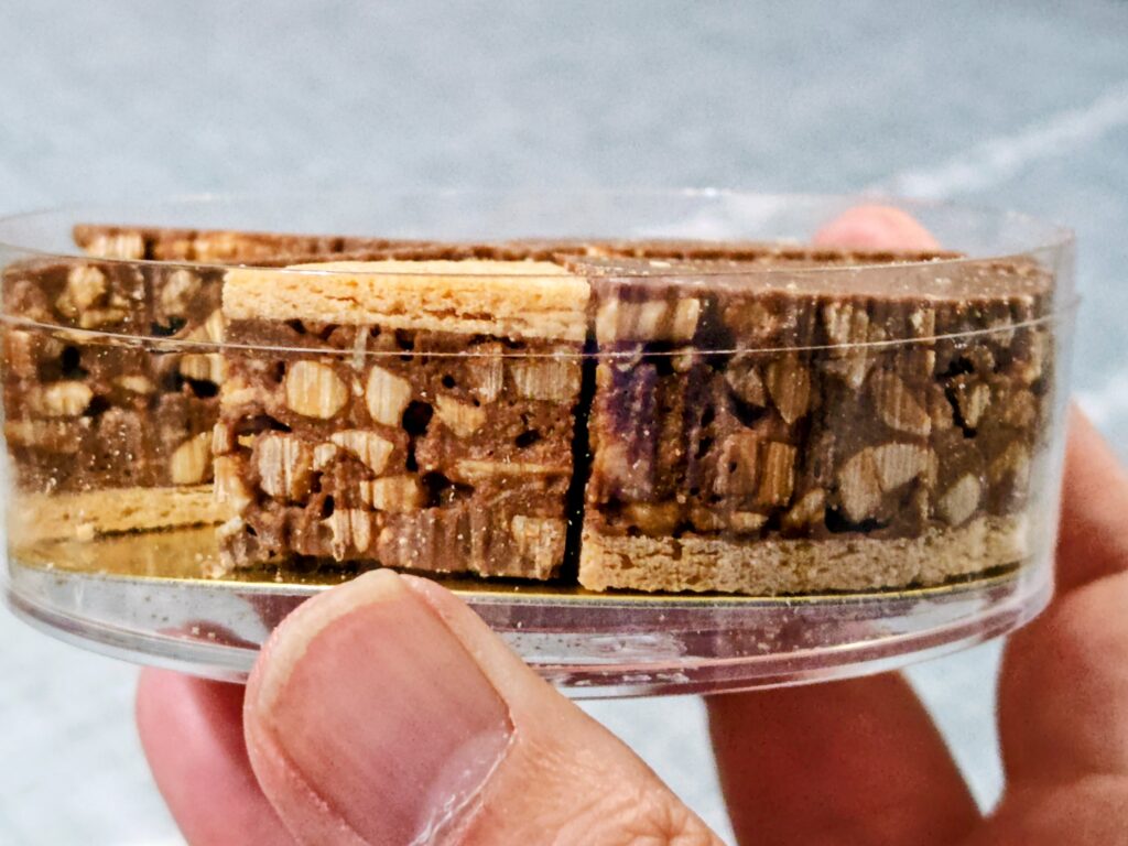 キャラメルリゼされたナッツがチョコレートとサブレでサンドされています。