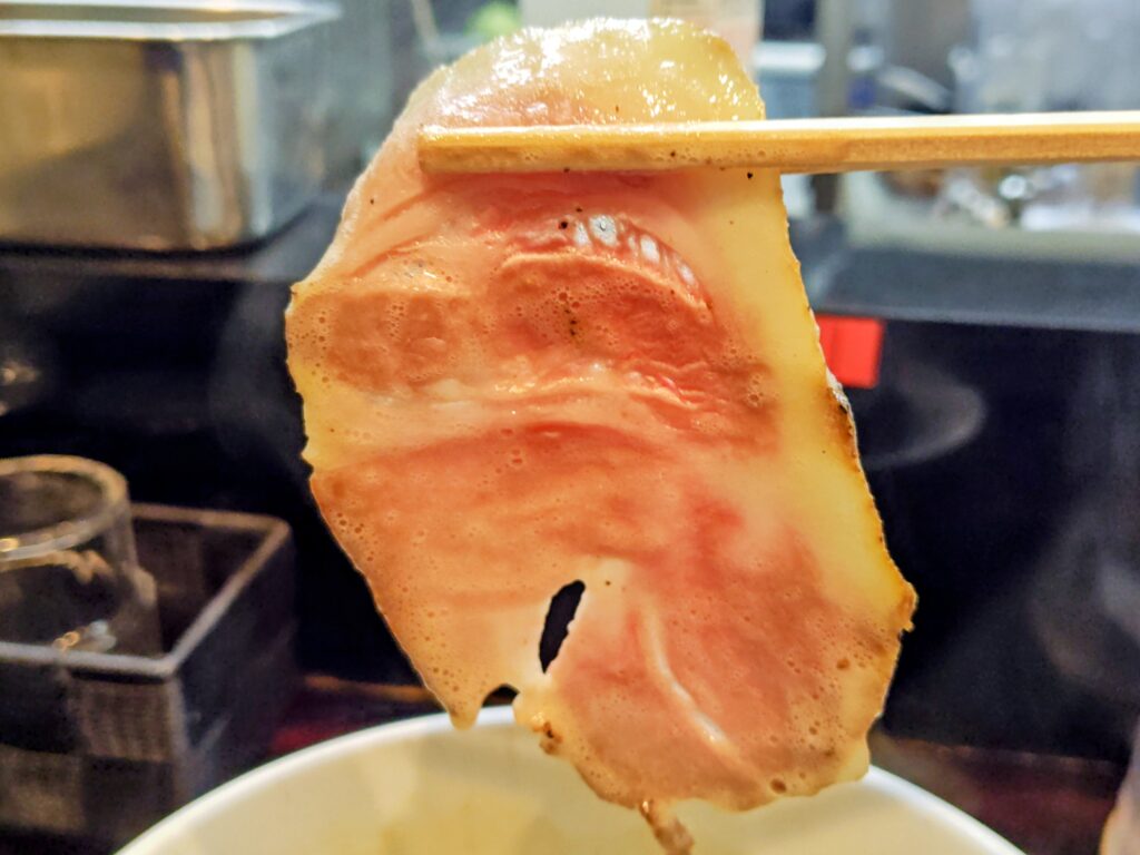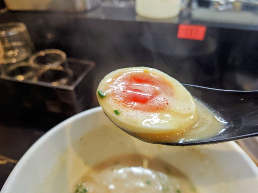 低温調理した豚肩ロースチャーシューはしっとり、メンマの食感味付けよく、味玉も優秀です。