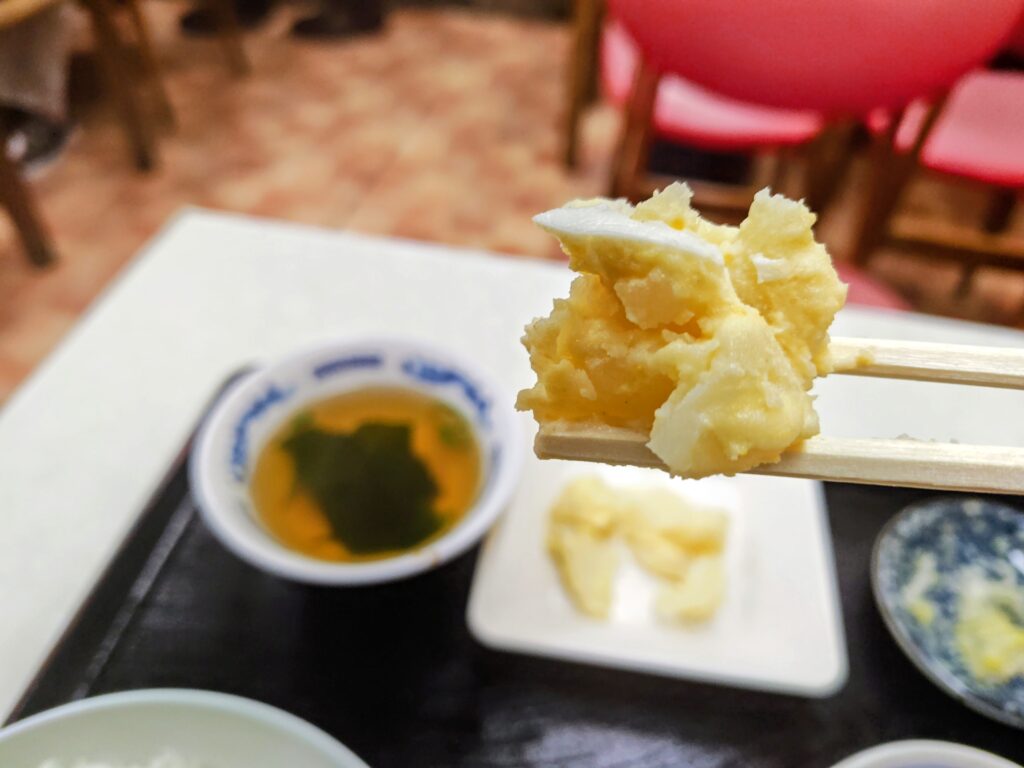 卵の白身、ジャガイモが粗挽きで昔懐かしく、すぶたと対照的にシンプルに仕上げています。