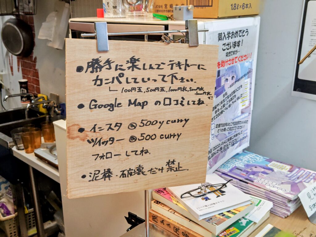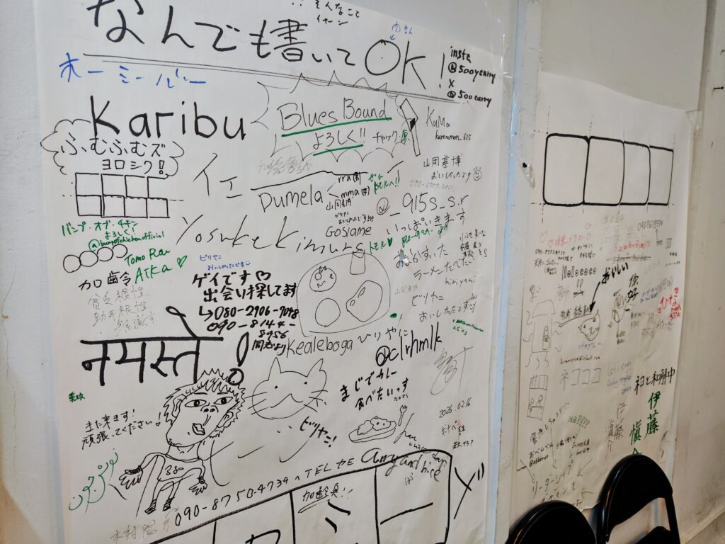 壁は何でも書いてもOKあり。スタンド店ですがパイプ椅子もあります。