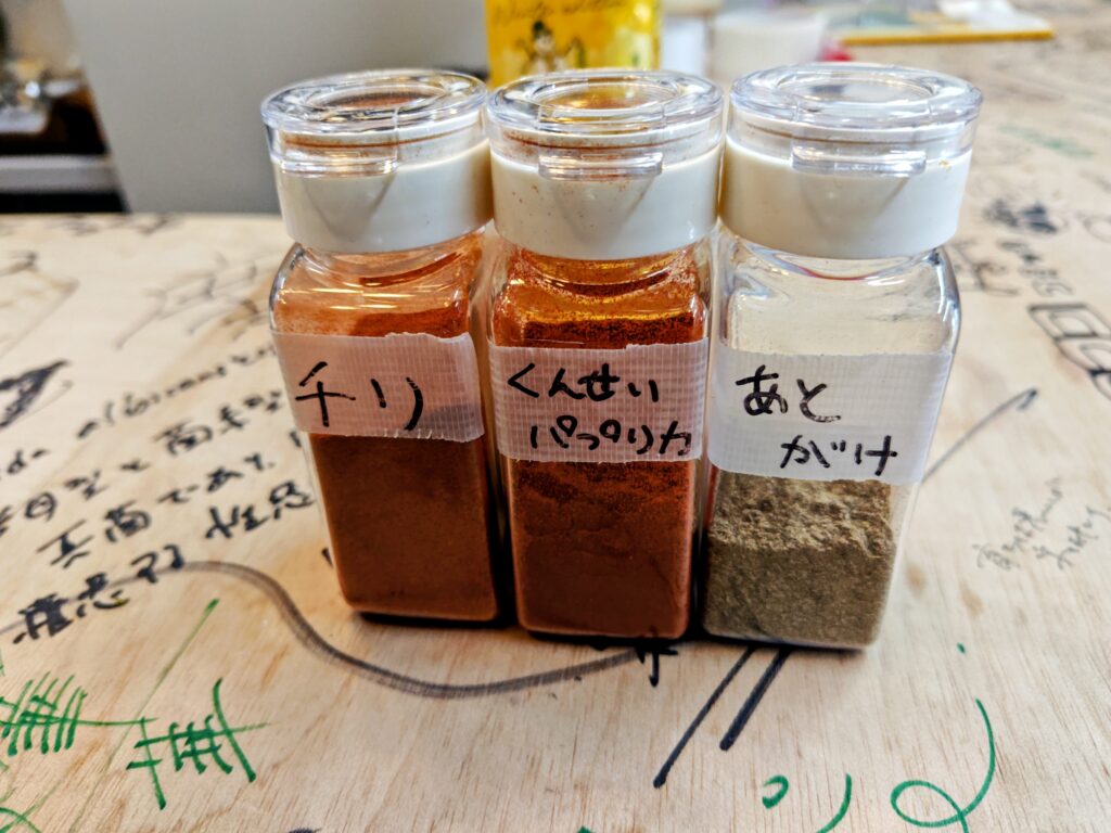 カレーと一緒にチリ、くんせいパプリカ、あとがけのスパイスの提供があります。