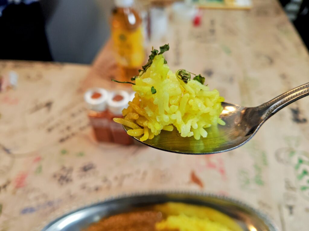 硬めに炊かれ、ホールスパイスのり濃厚なカレーと相性抜群です。