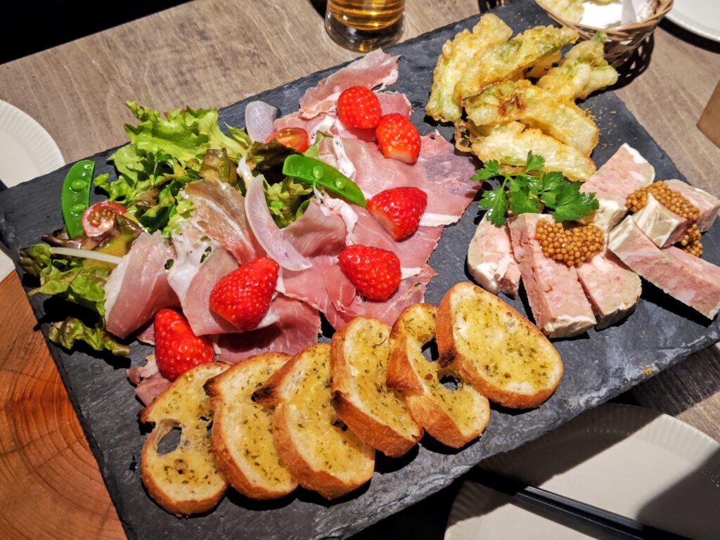 もう1皿は季節の苺が乗った生ハムサラダ、鴨肉のパテ、キノコのフリッタータにガーリックバケットとワインが進む味付けです。