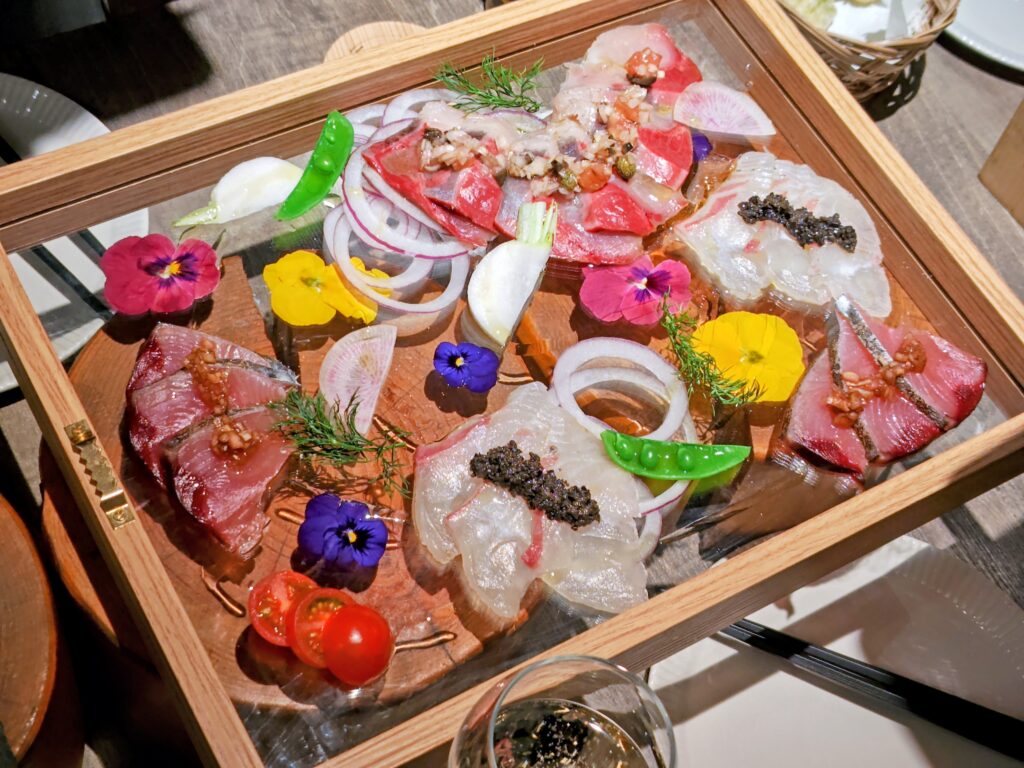 カラフルなお花がサンドされたお皿に彩り豊かなカルパッチョ!