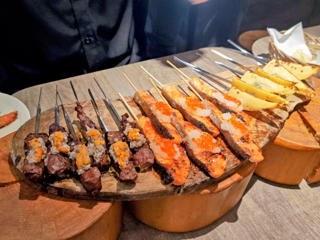 最上鴨の串焼き、サーモン串焼きイクラ乗せ、朝採れ筍の串焼き。