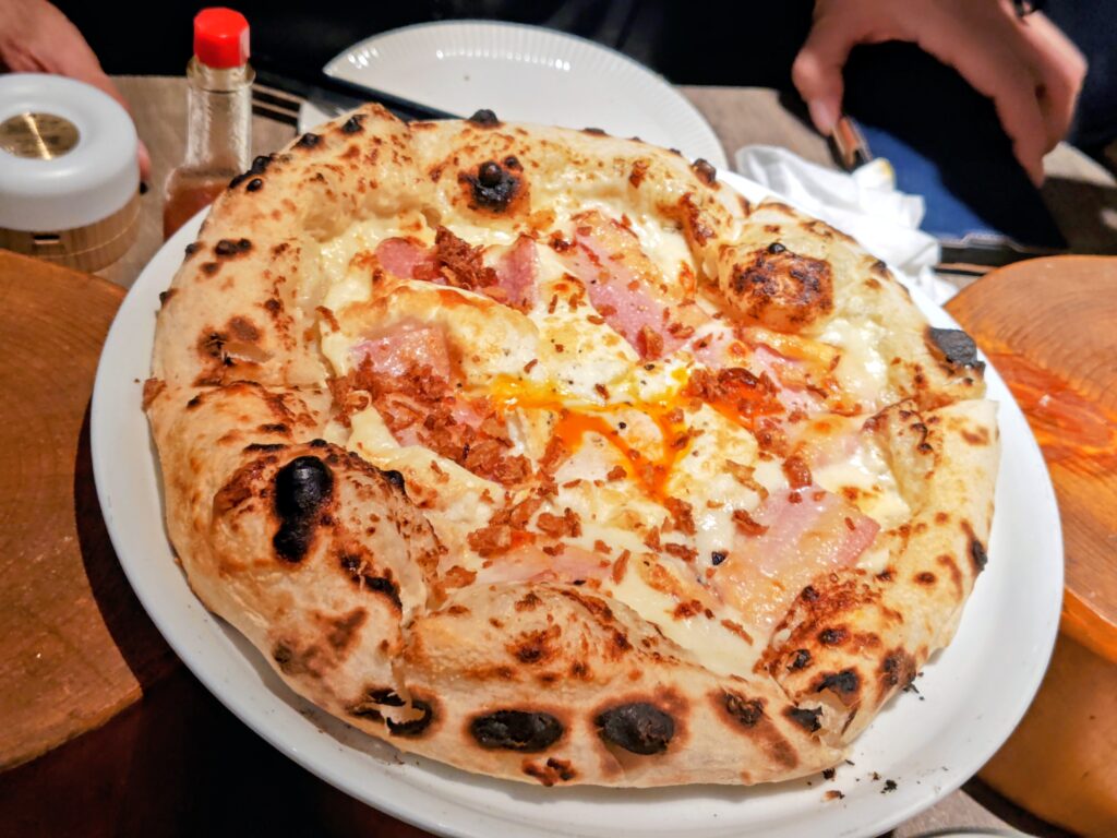 釜焼きの熱々のピザ!モチモチ生地にぴったりの具材の組合せです。