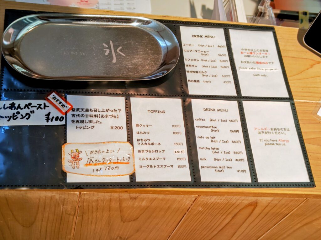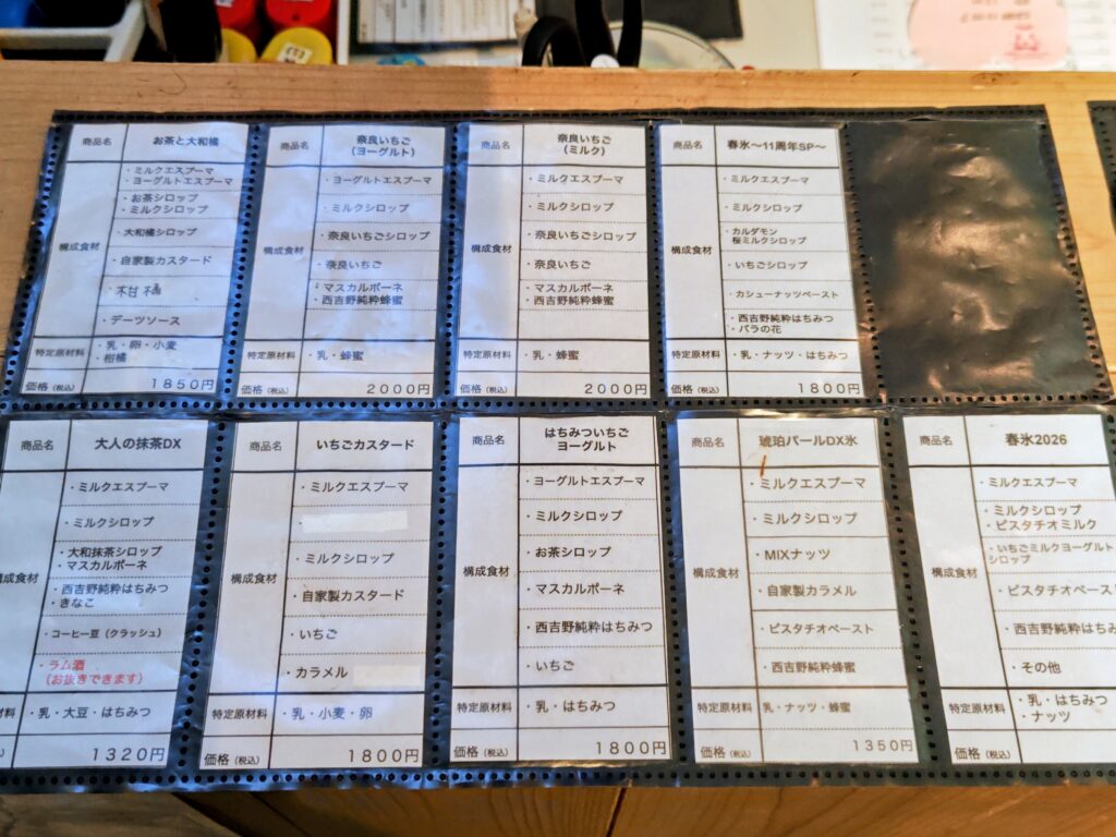 この日のかき氷ラインナップは9種類にトッピング、ドリンク。