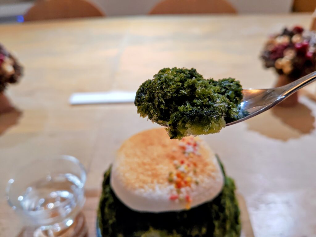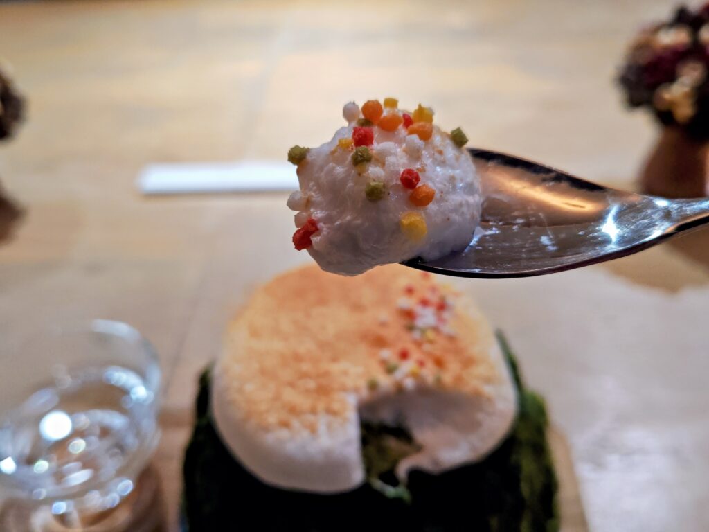 トップのミルクエスプーマはきなこ、小さいアラレが乗って。