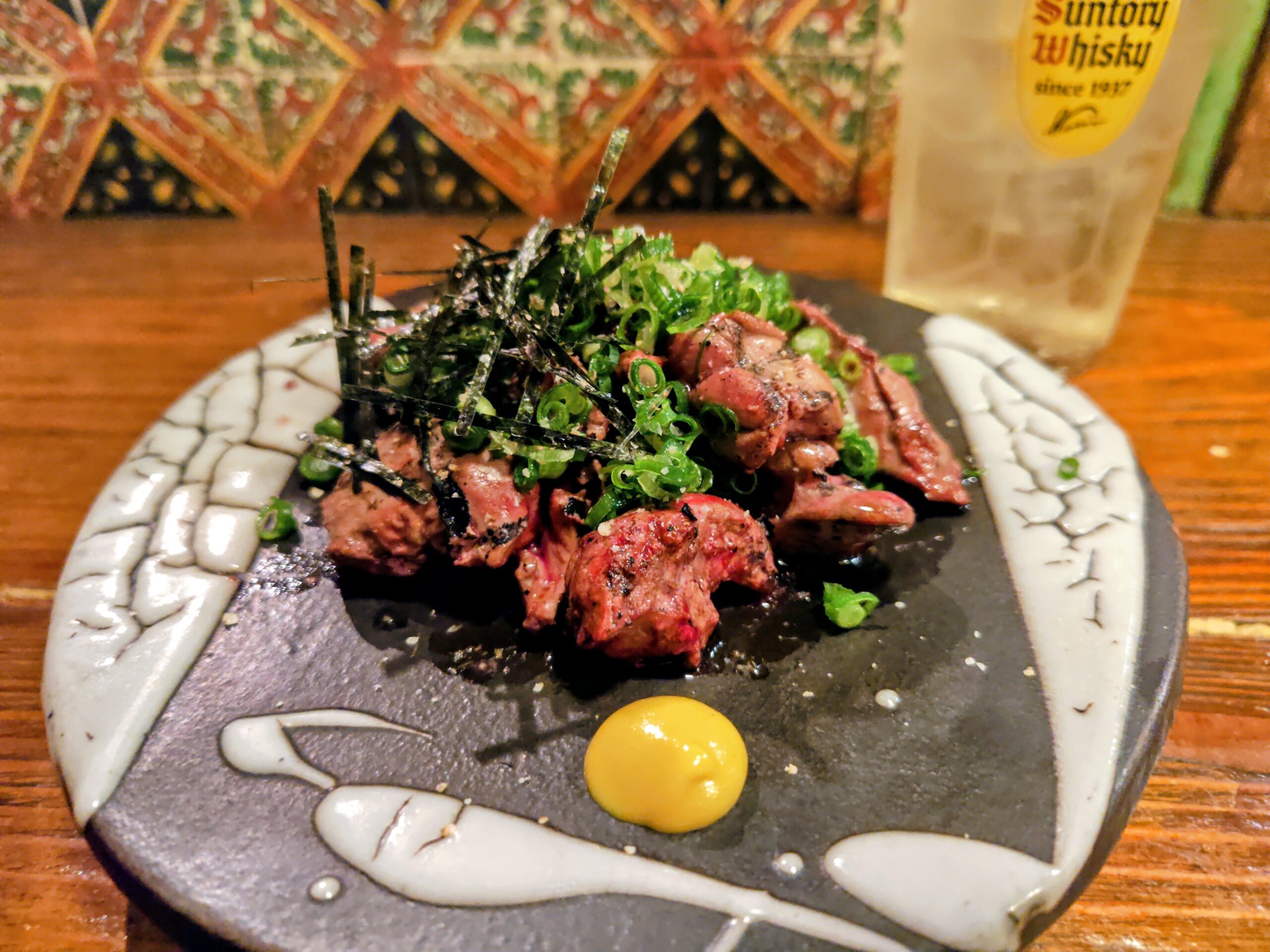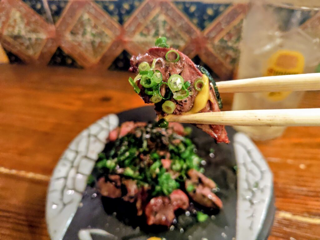 こちらも新鮮なレバーが炭火で焼かれ、刻み葱に刻み海苔のトッピング!