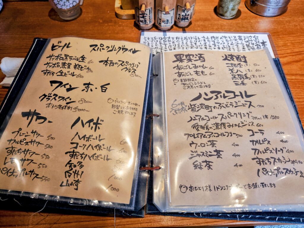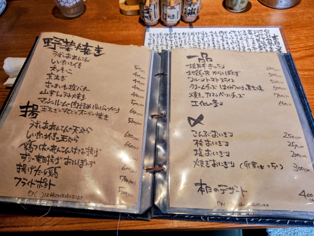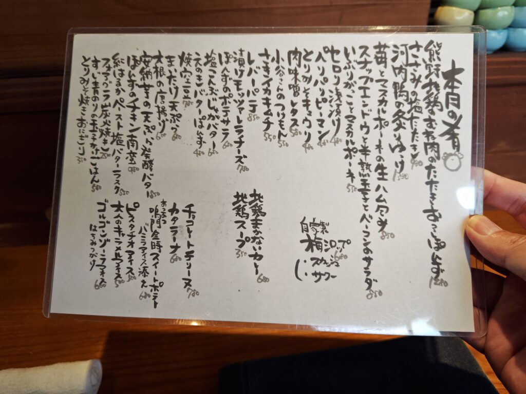 メニューは串、熊野地鶏タタキ、河内鴨タタキ、野菜焼き、揚、〆、本日のデザートに手書きとレパートリー豊富。