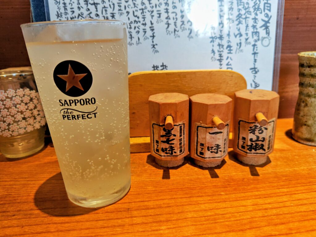 前方に食べた後の串入れ、京都祇園『原了郭』さんの一味、黒七味、粉山椒が置かれています。