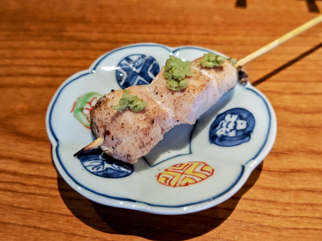 中はしっとりとレア感ある状態で提供され火入れはベスト!山葵の清涼感がマッチした串です。